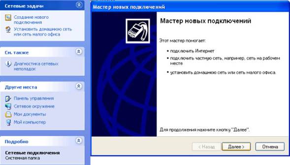 Создайте мастер нового сетевого подключения. Для этого выберите из меню расположеного слева и называемого "Сетевые задачи" пункт "Создание нового подключения".